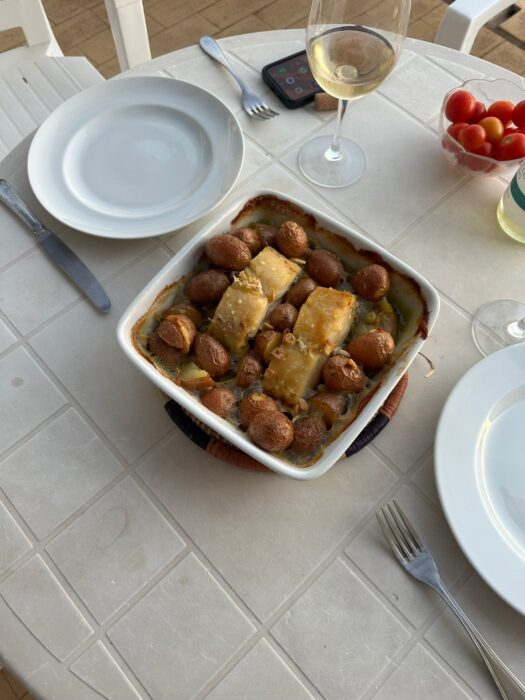 Para o jantar, havia um belo bacalhau no forno, regado generosamente com azeite.