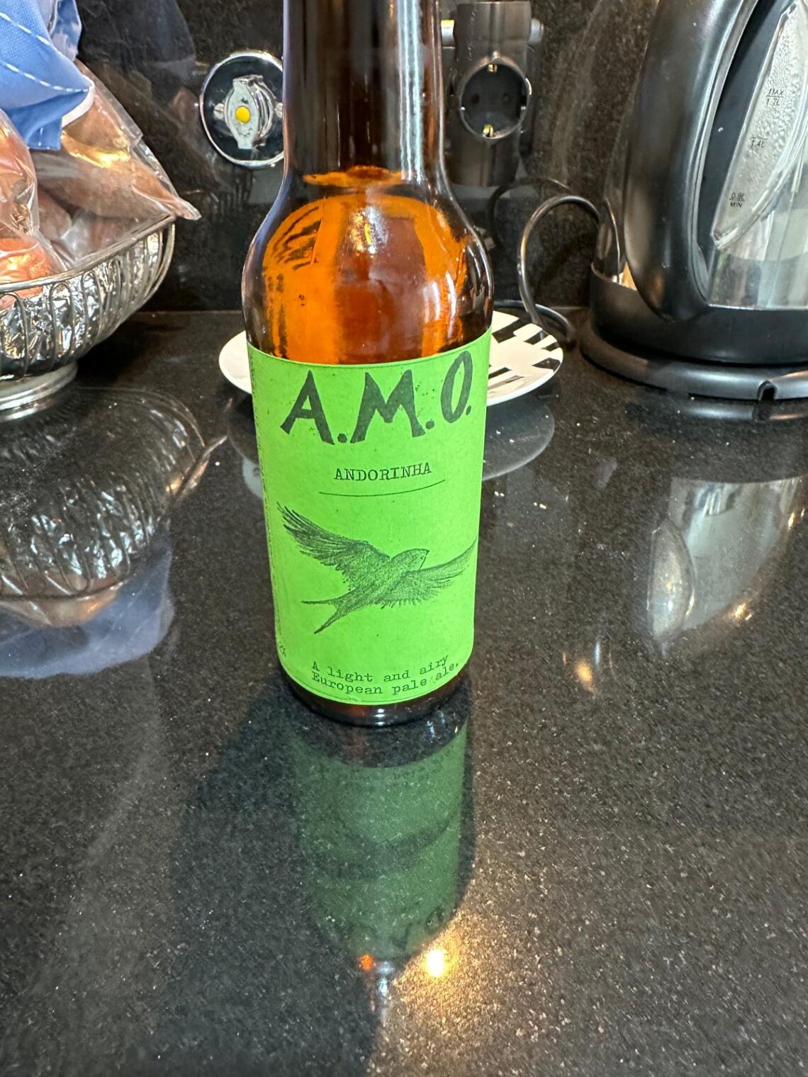 Á uns anos fiz amizade com uma rapariga a quem vendi um bilhete para assistir a um concerto dos Capitão Fausto.Como não podia ir, publiquei o bilhete no Facebook e a Catarina acabou por comprá-lo. Mais tarde, decidiu brindar-me com uma cerveja da sua região: a AMO. No sábado passado, à hora do almoço, decidi abrir a Andorinha.Como estava com muita sede, o primeiro gole foi intenso, estava bem fresca! Apesar de ser uma cerveja artesanal, tem uma suavidade surpreendente e não é amarga.Apresenta uma boa espuma e um toque frutado. É uma American Pale Ale, de cor amarelo forte, com 6,2% de álcool.Muito saborosa! A cerveja AMO foi criada pela canadiana Margaret Orlowski, que se apaixonou por Lisboa.O nome da marca tem as iniciais do seu nome, e segundo Margaret, “o melhor trabalho surge quando amamos o que fazemos”. Confesso que estou com muita vontade de visitar a loja…