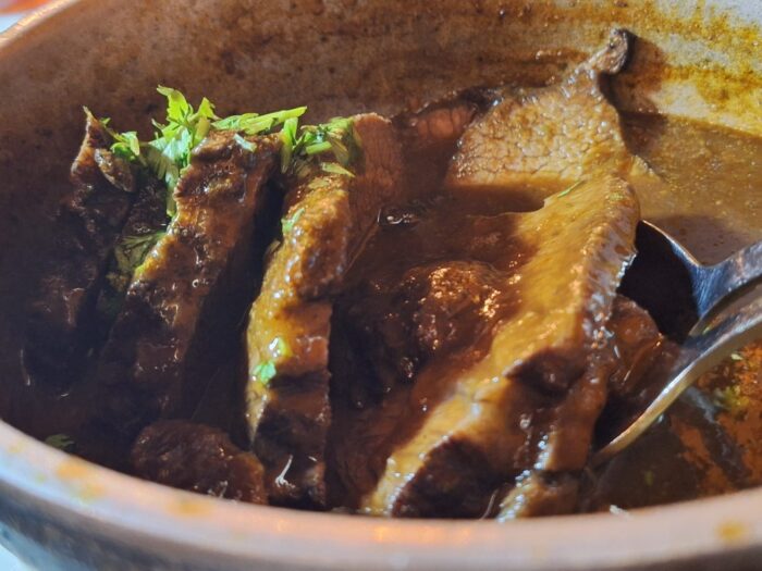 Seguiu-se um clássico reinventado com mestria: bochechas de novilho estufadas em vinho tinto. A carne desfazia-se à menor resistência do garfo, prova do tempo, da paciência e do saber. O vinho, discreto mas presente, elevava os aromas e envolvia a carne num manto de sabor profundo. Os legumes que escolhi como acompanhamento revelaram-se frescos, bem tratados, e quebravam com elegância a untuosidade do prato.