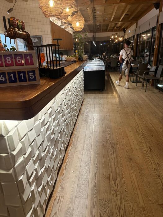 O espaço está agora bem decorado, com balcões longos onde o peixe está exposto com destaque.