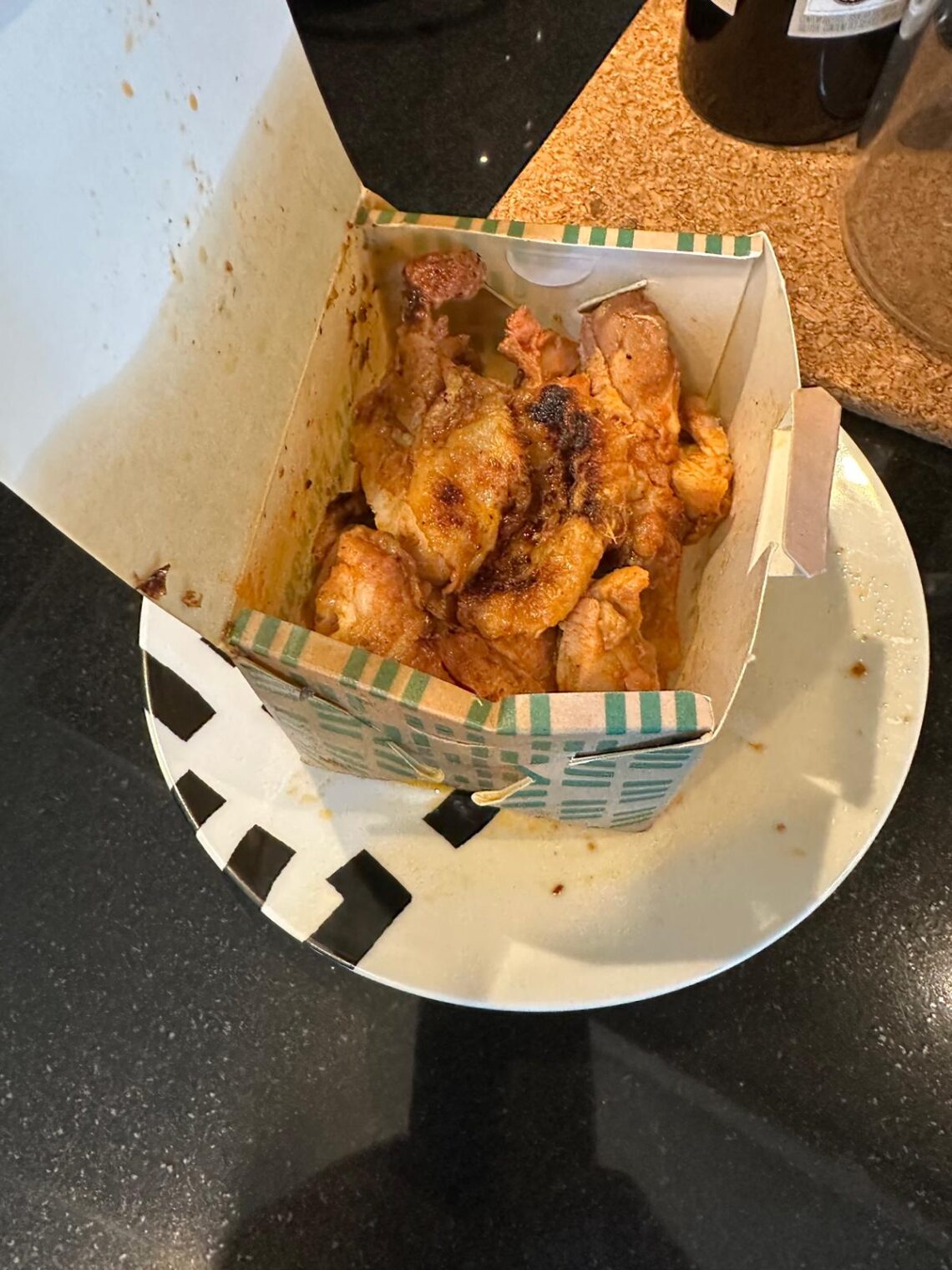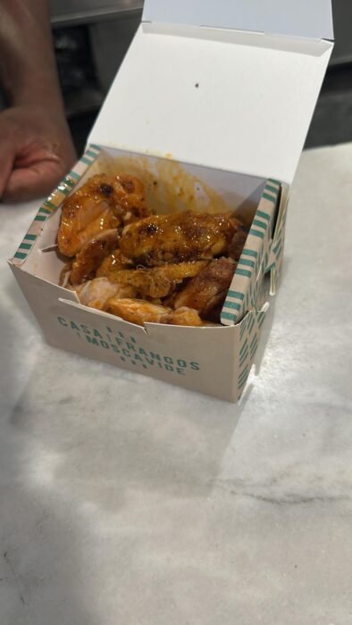 Aqui confesso que errei: a caixa de papel onde o frango é colocado não aguenta tanto molho e acabou por entornar.